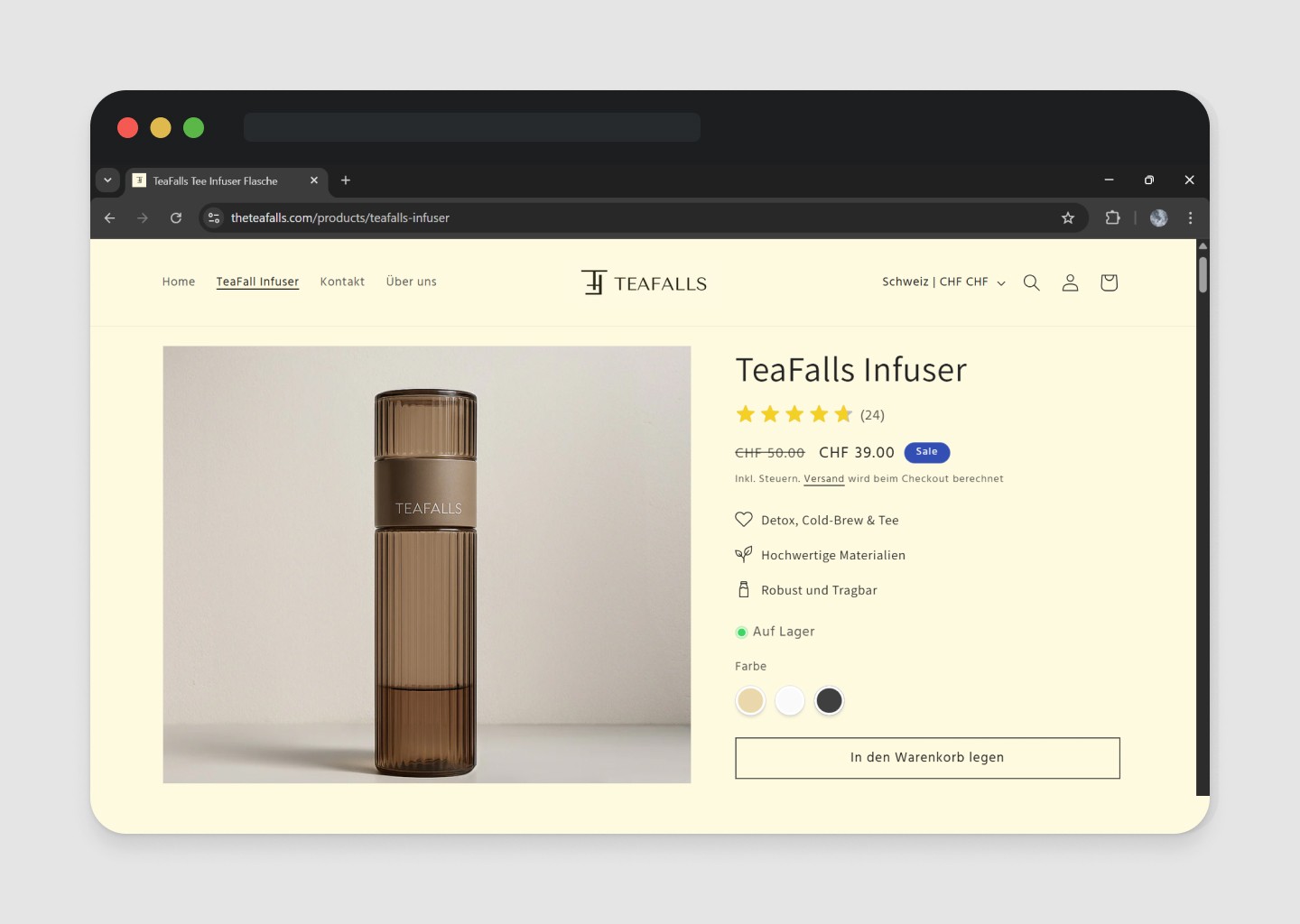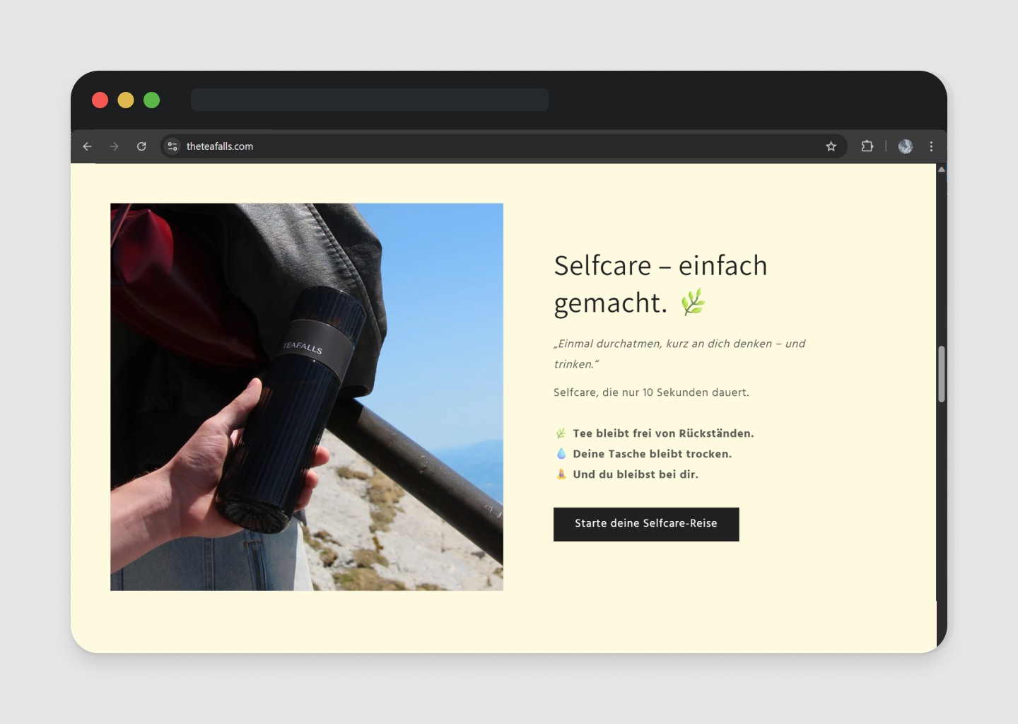 TeaFalls war ein eigenständig aufgebautes DTC-E-Commerce Projekt im Bereich Lifestyle & Tea Culture. Ziel war es, eine stilvolle und praktische Tea-Infuser Flasche für unterwegs zu entwickeln und als Marke zu etablieren.