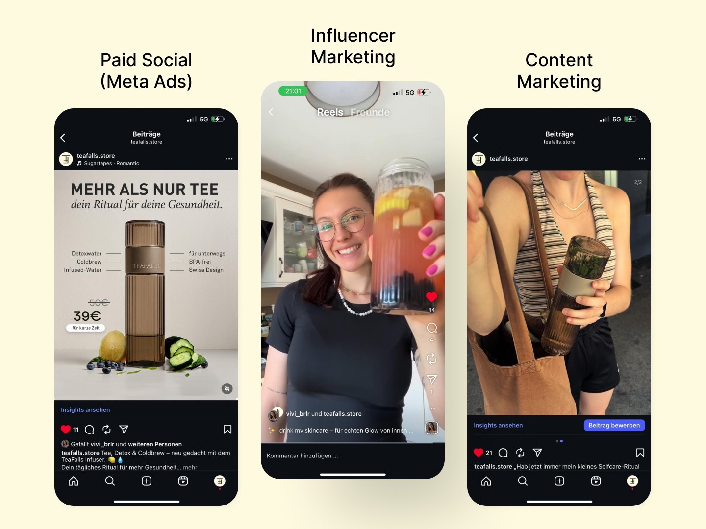 Mit dem TeaFalls Circle entstand ein kleines Affiliate-Programm für Micro-Influencer (10k–30k Follower) aus den Bereichen Health, Lifestyle, Fitness & Food. Influencer erhielten das Produkt kostenlos sowie 20 % Affiliate Provision vom Umsatz pro Verkauf durch dessen Rabattcode
